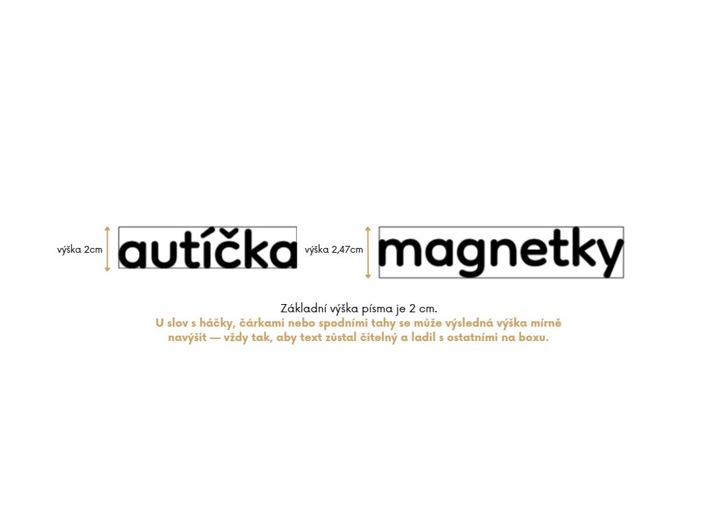 U slov s háčky, čárkami nebo spodními tahy se může výsledná výška mírně navýšit — vždy tak, aby text zůstal čitelný a ladil s ostatními na boxu.